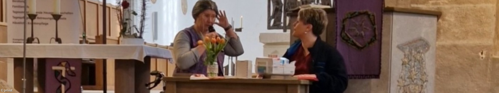 So der Titel des Gottesdienstes am Sonntag Laetare im Münster St Wunibald in Heidenheim. Zusammen mit Pfarrer Johannes Heidecker gestalteten ihn die Mitarbeiterinnen der Diakoniestation Heidenheim sowie der Geschäftsführer der Alten- und Krankenpflege gGmbH Martin Meister. Mit einem sehr anschaulichen Anspiel berichteten Pflegedienstleiterin Maxine Härtlein und Schwester Ulrike Minderlein von der Arbeit und den Angeboten der Diakniestation. Oft ist für Pflegebedürftige und deren Angehörige die Schwelle hoch, diese professionellen Hilfsangebote in Anspruch zu nehmen. Sich einzugestehen, dass man Hilfe braucht, ist oft mit Scham verbunden. Darauf ging Pfarrer Johannes Heidecker in seiner Predigt ein. Er dankte den Schwestern der Diakonie für ihren Dienst und für ihre liebevolle Zuwendung zu den ihnen anvertrauten Menschen.